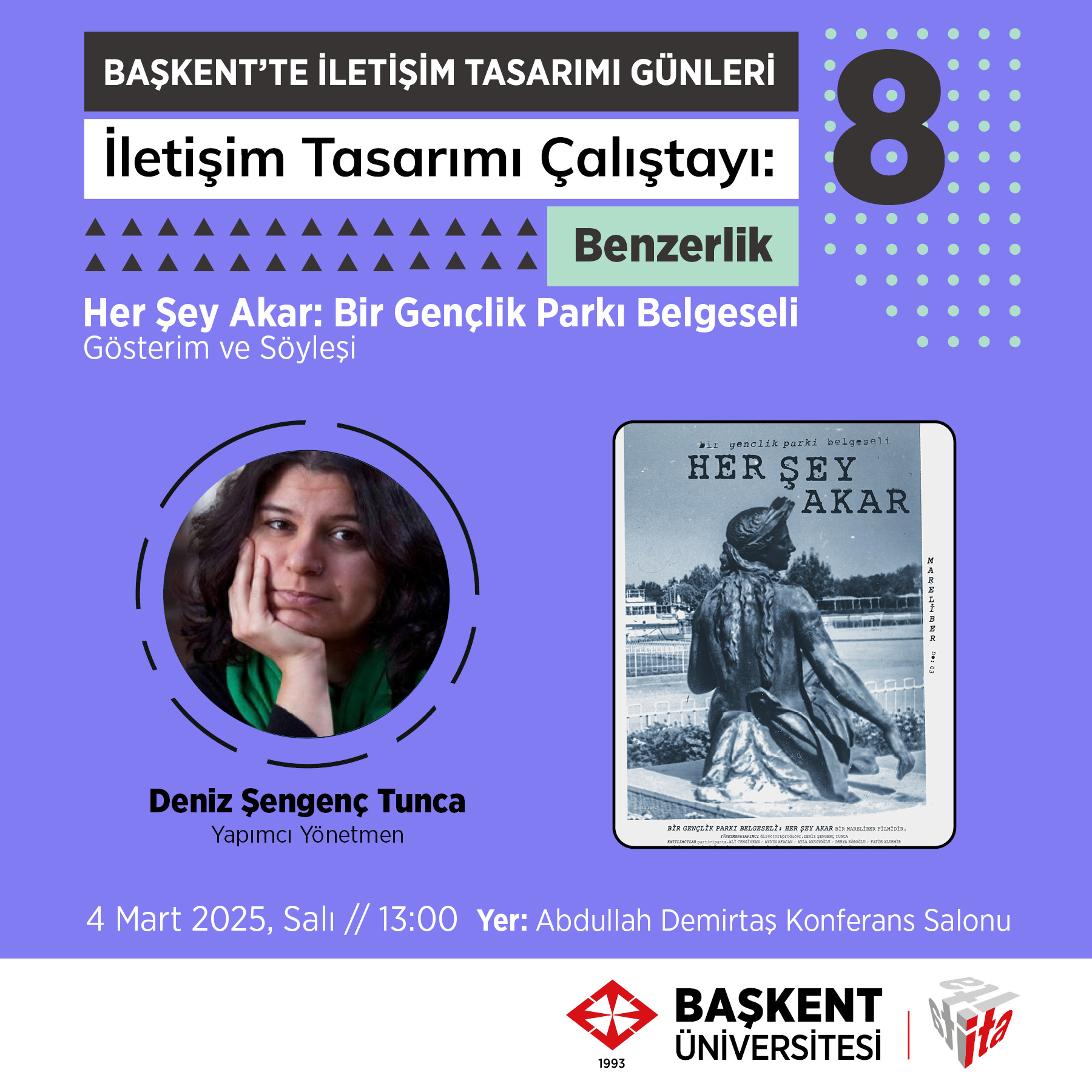 Başkent'te İletişim Tasarımı Günleri - İletişim Tasarımı Çalıştayı 8, Yapımcı Yönetmen Deniz Şengenç Tunca'nın katılımıyla gerçekleştirilecek "Her Şey Akar: Bir Gençlik Parkı Belgeseli" gösterimi ve söyleşiyle başlıyor.